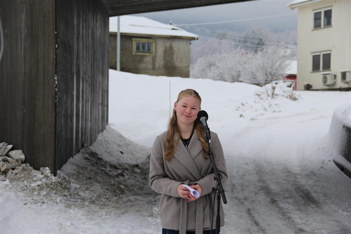 Leder i elevrådet ved Ringebu ungdomsskole, Gina Hjelstuen.Ringebu ungdomsskole har vært en av de nærmeste naboene til byggeprosjektet. Representanter fra 8. og 10. trinn var til stede på åpningen, og elevrådslederen holdt en tale, der hun blant annet understrekt hvor viktig det er få tryggere vei.