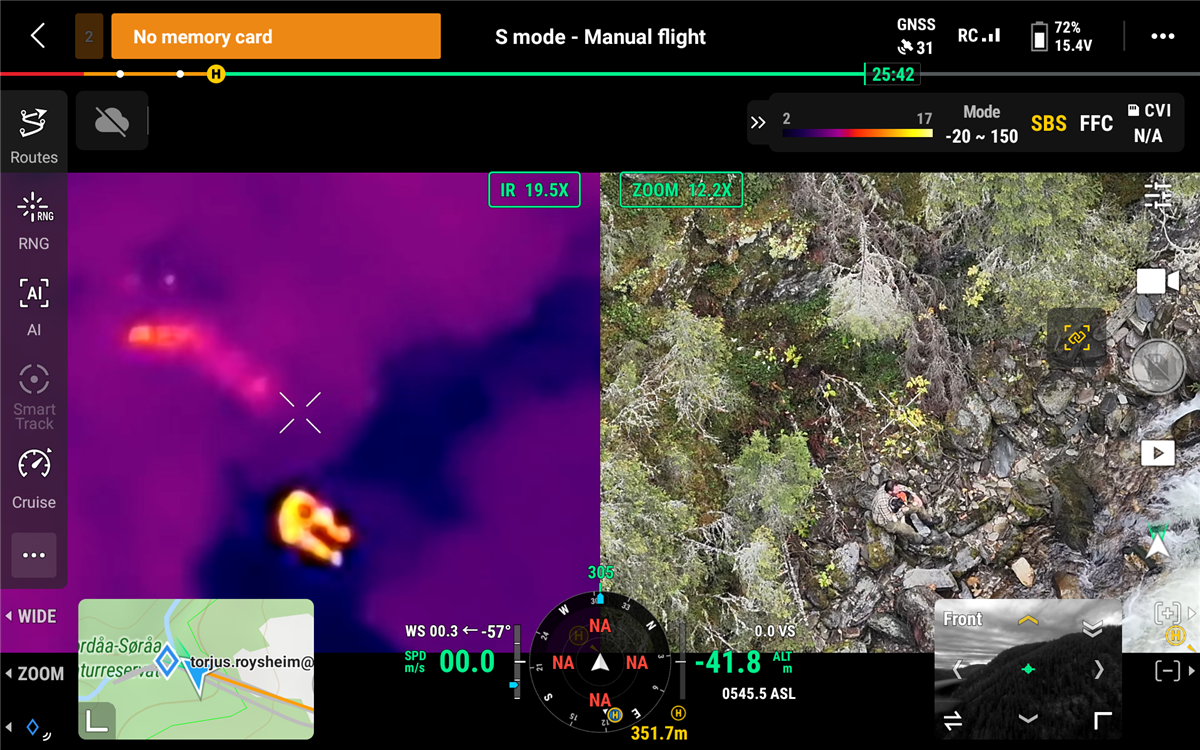 – Jeg visste hunden var i området Halvfarelia/Nordåa-Søråa/Nyhamnbekken, så det gikk heldigvis veldig raskt å finne ham. Det er en del skog og ulent terreng i området, så fra bakken er det ikke så lett. Men med termisk kamera fra lufta var det ikke noe problem, sier dronelærling Truls.