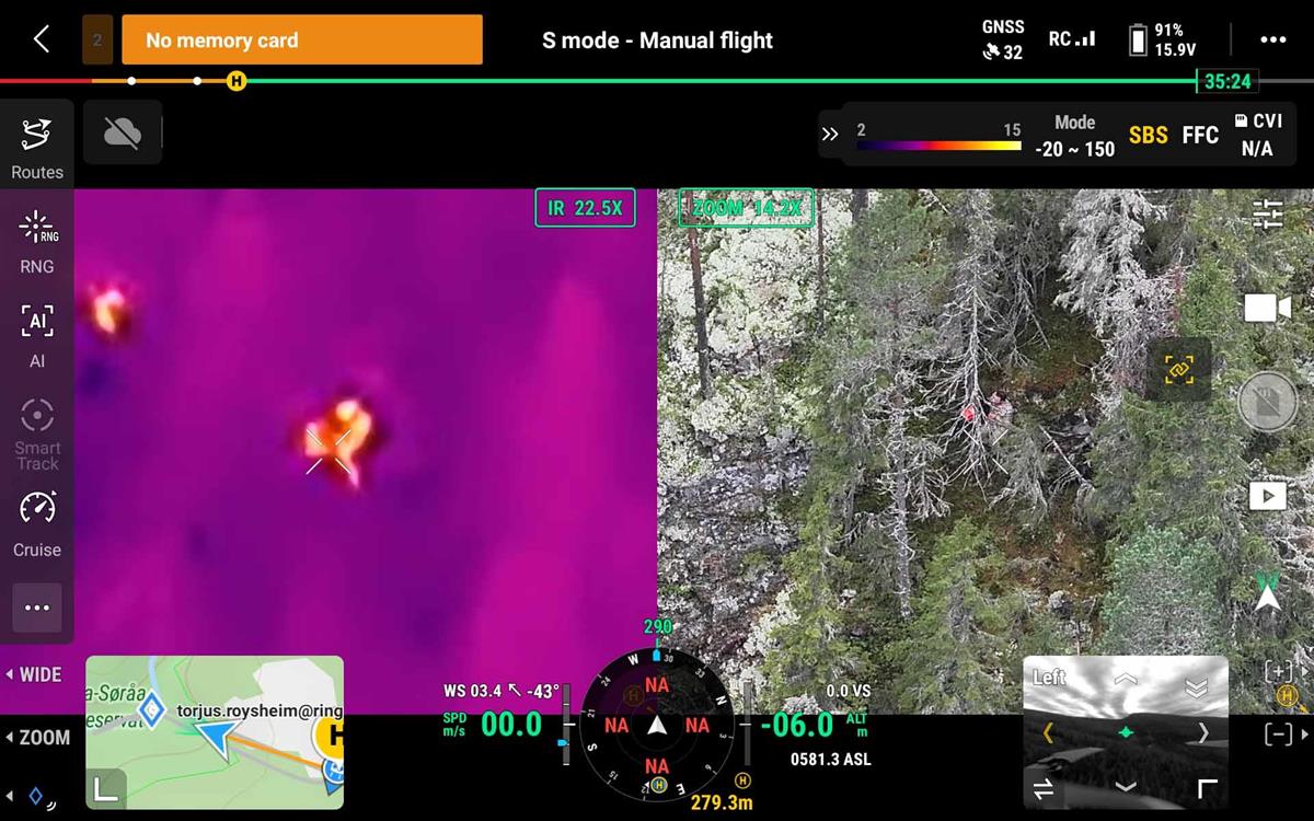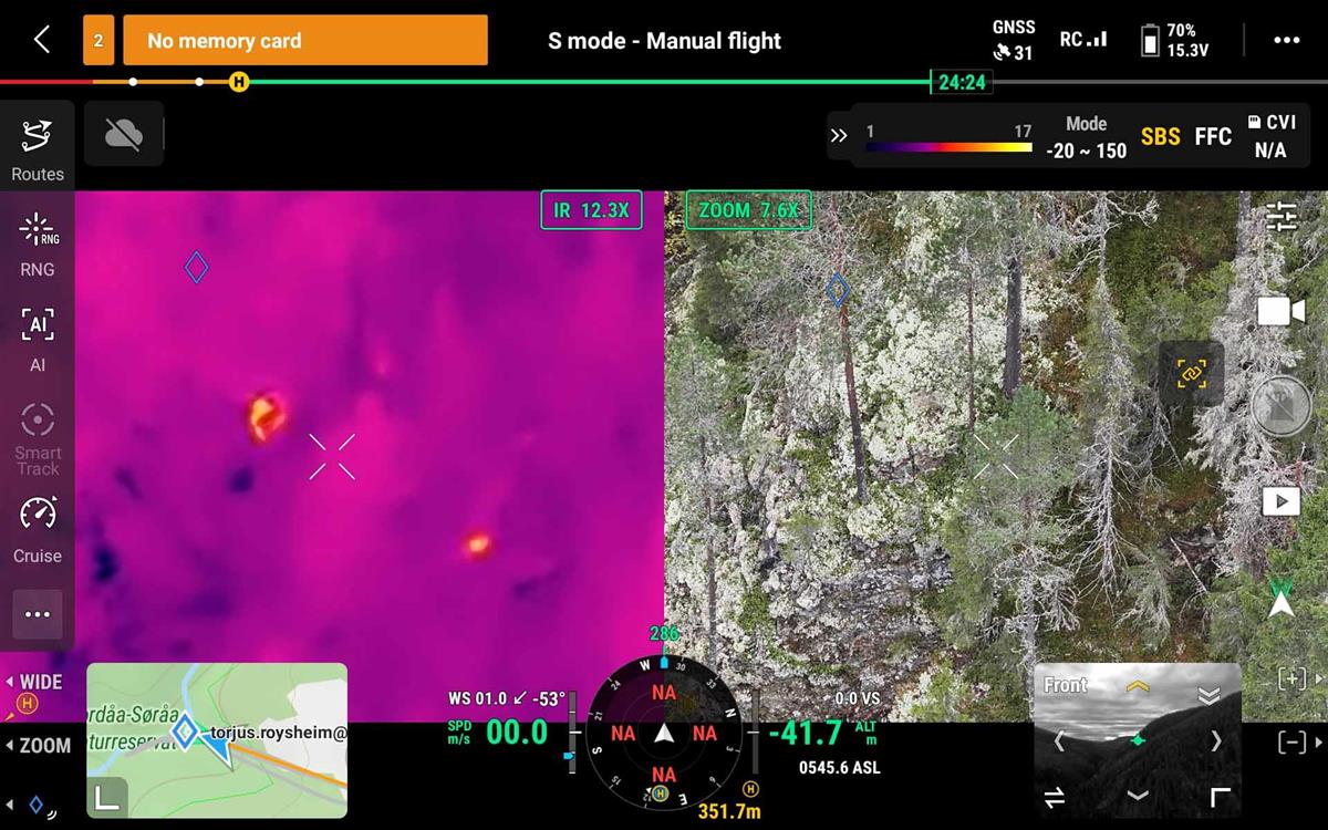 Ikke godt å se med det blotte øye, men det termiske kameraet på dronen fanger opp varmesignal.