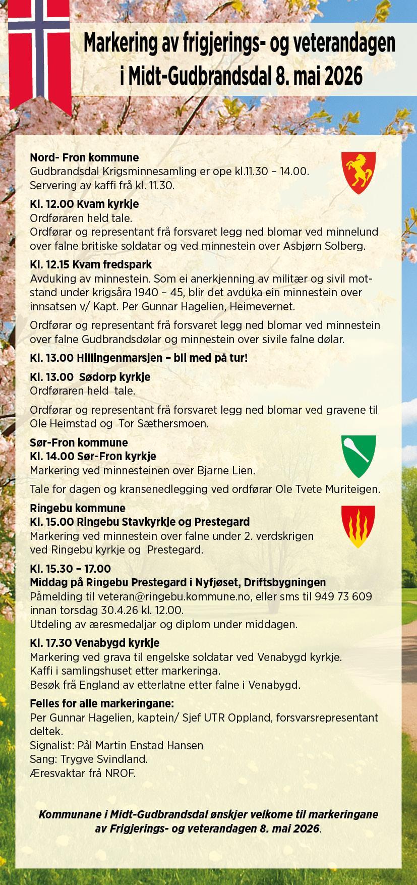 Markering av frigjørings- og veterandagen 8. mai 2026Kommunene i Midt-Gudbrandsdal har felles markering av frigjørings- og veterandagen