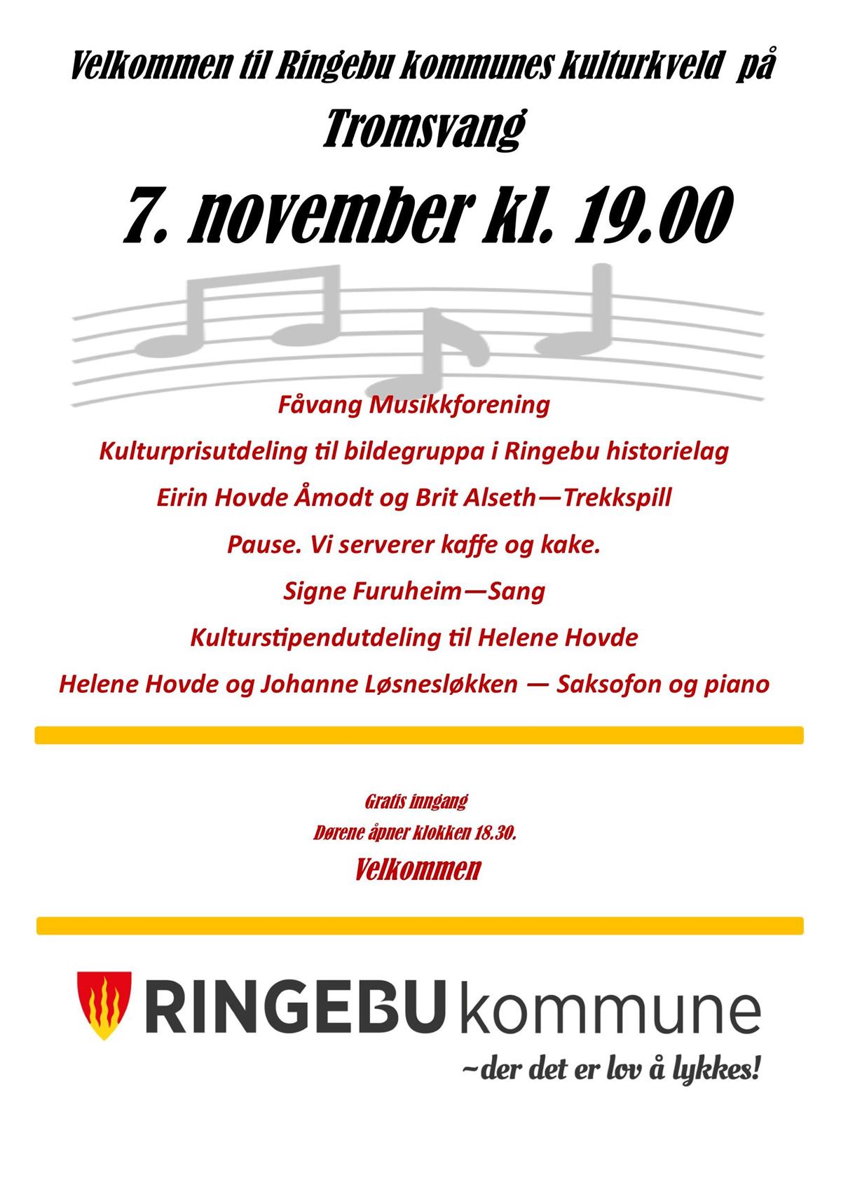 Ringebu kommunes kulturkveld fredag 7. november kl. 19.00 på Tromsvang kl. 19.00Vi ønsker velkommen til Ringebu kommunes kulturkveld med tildeling av kulturprisen 2025 til bildegruppa i Ringebu historielagog kulturstipend 2025 til Helene Hovde