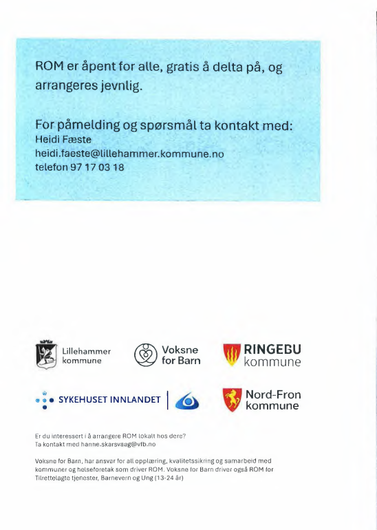 ROM - felles læringsarena der fagfolk og pårørende/berørte møtes til likeverdig dialog.ROM - nytt møte:Dato: 09.12.2025Sted: Storgata 9B, LillehammerTid: Kl. 18.00 - 19.45ROM for medvirkninger et likeverdig dialogmøte mellom pårørende, berørte, foreldre og fagpersoner innen område psykisk helse og rus.Les mer om prosjektet ROM og praktiske opplysninger